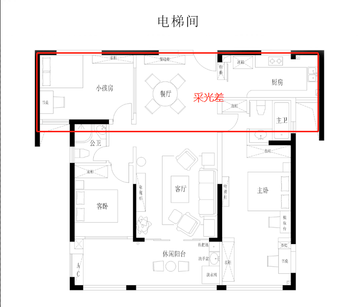 ③采光差,房型靠内侧的空间采光差。