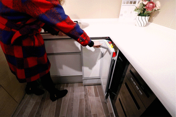 靠近操作台的地方可以做一个翻转抽屉,收纳清洗物品。
