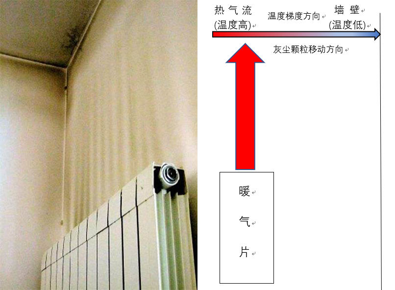 熏黑的原因不是买到了山寨的暖气片,而是所谓的热泳现象,又叫索瑞特现象:在流体中有稳定温度梯度存在时,流体中的固体颗?;岢盼露冉系偷姆较蛟硕?。定性来看,高温区域流体分子运动更剧烈,对固体颗粒的撞击力更大,就把固体颗粒“推”到低温的地方去了。简单来说,因为暖气片和它背后/上方的冷墙面有温度梯度,空气在流过它们之间时,颗粒物会吸附到较冷的墙面上,导致墙壁被熏黑了。