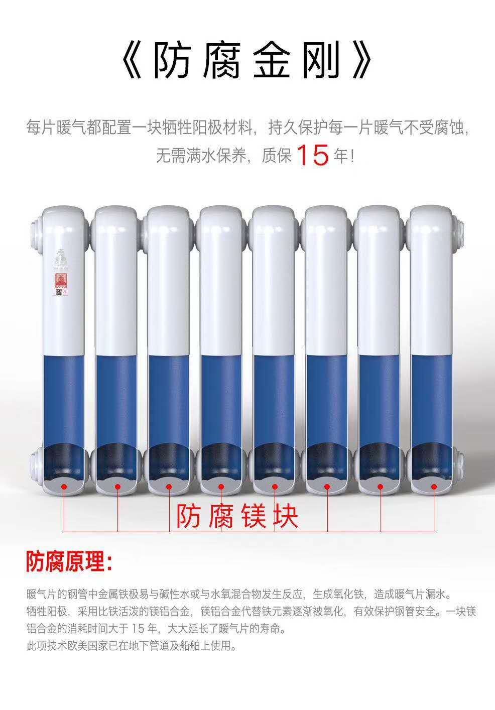 我们了解一下钢制暖气片的使用寿命:通常在5年以上。针对传统钢制暖气片容易氧化腐蚀的问题,已经有企业研究开发升级换代产品——防腐金刚。防腐金刚介绍:防腐金刚6030F,是专利产品。它是一款具有颠覆性的钢制暖气片,拥有钢制的性价比,防腐性能又远高于普通钢制暖气片。防腐金刚6030F暖气片,采取了在钢制散热器的底部加装特殊镁铝合金,用活泼的镁铝合金先与水中的离子产生氧化反应,以避开“垢下腐蚀”和“底部金属腐蚀”。一块镁铝合金的消耗时间大于15年,大大延长了暖气片的寿命,无需满水保养,质保15年。
