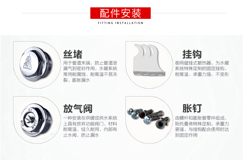 家用暖气片有四个不可或缺的配件,分别是跑风、丝堵、挂钩和胀钉。
