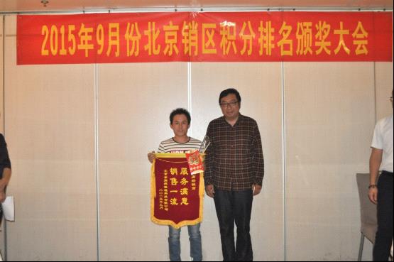 2015年10月12日,北京金旗舰暖通科技有限公司2015年度9月份北京区优秀代理商表彰大会隆重举行,本次会议对2015年9月份北京销区积分排名表现优异的代理商给予表彰,奖杯、锦旗、铜牌、证书、现金红包现场颁发,气氛热烈。