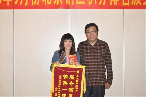 金旗舰总经理杨总、副总经理高总分别为第一名运桥店获奖者卢飞、第二名东坝店获奖者赵进伟、第三名金五星店获奖者崔金凤 颁发红包、奖杯、锦旗、铜牌